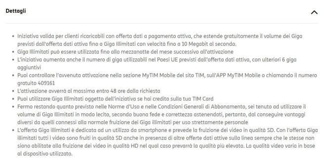 Per attivare la promozione è necessario accedere a Tim Party (link in FONTE) e seguire le istruzioni. Giga illimitati estende il volume della propria offerta attiva con una velocità massima di 10 Megabit al secondo. L’attivazione avverrà entro un massimo di 48 ore dalla richiesta.