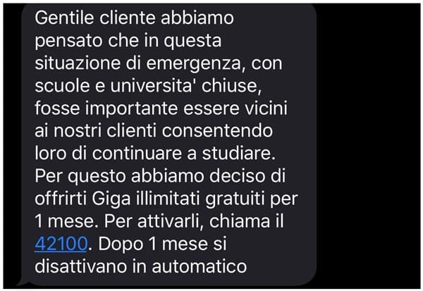 Per favorire l’accesso al digital learning in questa situazione di emergenza per l’epidemia del Coronavirus, con scuole e università chiuse, Vodafone ha deciso di eliminare il limite di Giga per gli studenti in tutta Italia a partire dalle Scuole Superiori. Ecco che tutti i giovani clienti dell’operatore riceveranno un SMS per attivare Giga illimitati gratis per un mese. I Giga illimitati si disattiveranno in automatico dopo un mese.