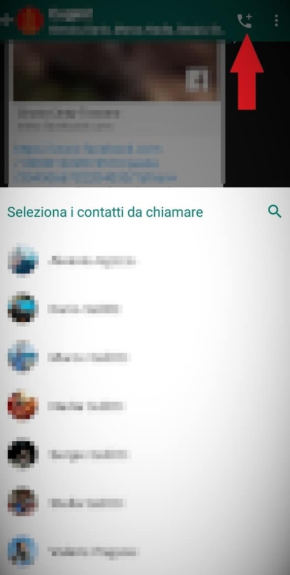 La seconda opzione è quella di creare un nuovo gruppo toccando i tre puntini verticali in alto e selezionando l’opzione “Nuovo gruppo” e scegliendo i contatti da aggiungere. Creato il gruppo, basta toccare l’icona con la cornetta con il tasto +, scegliere i partecipanti da invitare (foto in basso) e poi l’icona della videocamera.