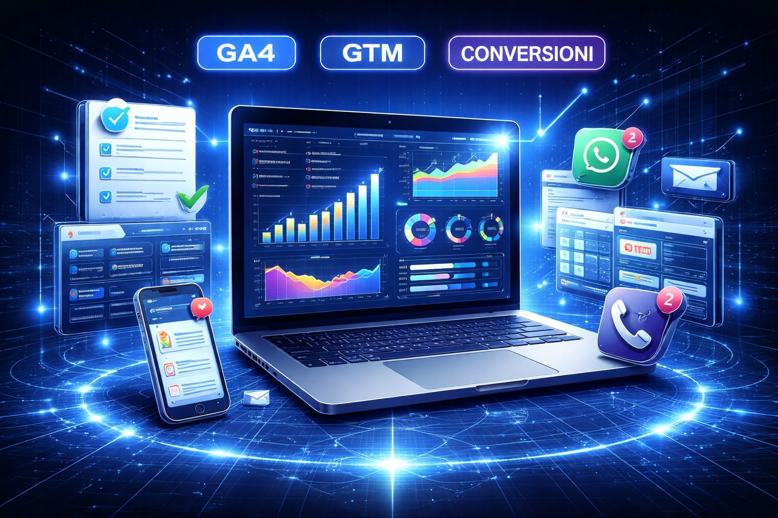 GA4 + Tag Manager Conversioni ROI / Ads GA4 e Google Tag Manager: traccia le conversioni (davvero) e smetti di investire “a sensazione” Se fai campagne o lavori sulla SEO, la domanda è una sola: cosa porta contatti e vendite? Senza un tracciamento pulito (GA4 + GTM), rischi di guardare numeri belli ma inutili. Qui